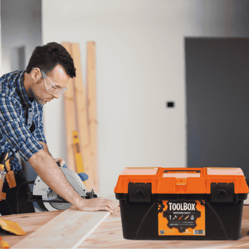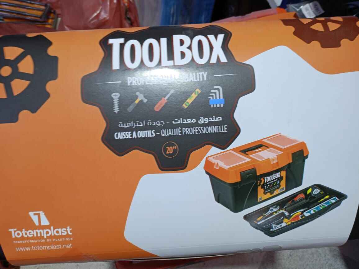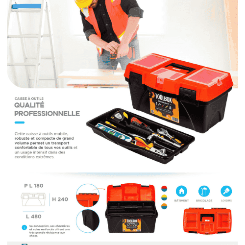 صندوق أدوات مصنوع بجودة عالية، مخصص للحرفيين، التقنيين وحتى لمحبي الأشغال اليدوية في الدار. يتميز بتصميم قوي يجمع ما بين المتانة وسهولة الاستعمال. يجي بلون برتقالي وأسود، مع غطاء فيه أماكن تخزين صغيرة للأشياء الدقيقة، وطبقة داخلية قابلة للنزع تساعدك تنظم الأدوات تاعك بكل سهولة.