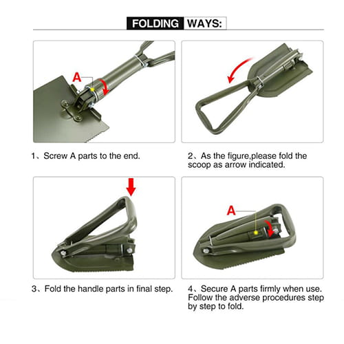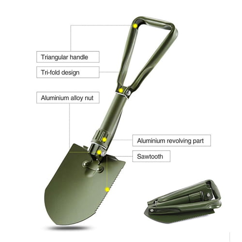 تتميز بتصميم صلب مصنوعة من الفولاذ الصلب ذو متانة عالية، مع حجمها الصغير عند تفكيكها ، يسهل تخزين هذه المجرفة في صندوق السيارة أو في حقيبة. وبالرغم من تصميمها المضغوط وخفيف الوزن ، فإنه بإمكانها كسر الجليد وحفر الأرض وقطع المواد والعديد من المهام الأساسية الأخرى، كما أنها تعتبر أداة ممتازة في حالات الطوارئ