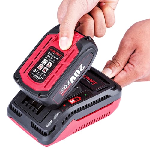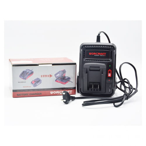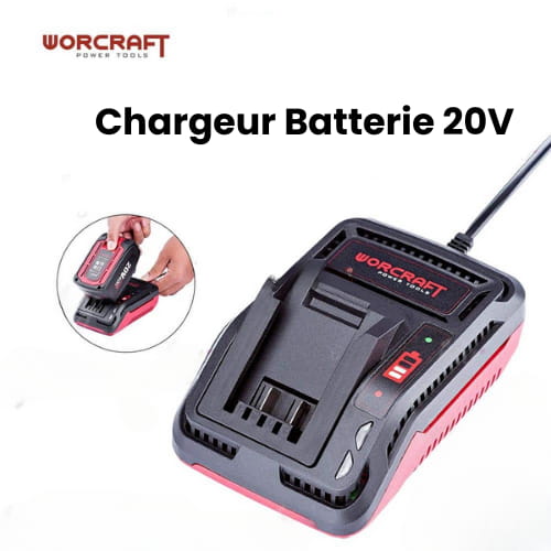 Une Chargeur Batterie 20 V WORCRAFT conçu pour charger rapidement les batteries rechargeables de la gamme ONE FOR ALL TM Warcraft
