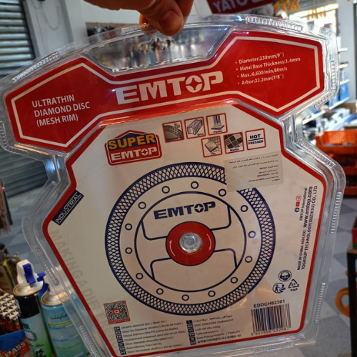 قرص قطع ماسي (disque diamant) مخصص لقطع البلاط (carrelage). يتميز بحافته الرقيقة (ultrathin) لتوفير دقة عالية في القص، ويُستخدم مع الماء (WET) لتقليل الغبار وتبريد القرص أثناء التشغيل. مناسب للاستخدام المهني في ورشات البلاط والبناء. قطره 230 ملم ويعمل بسرعة تصل إلى 6600 دورة في الدقيقة.