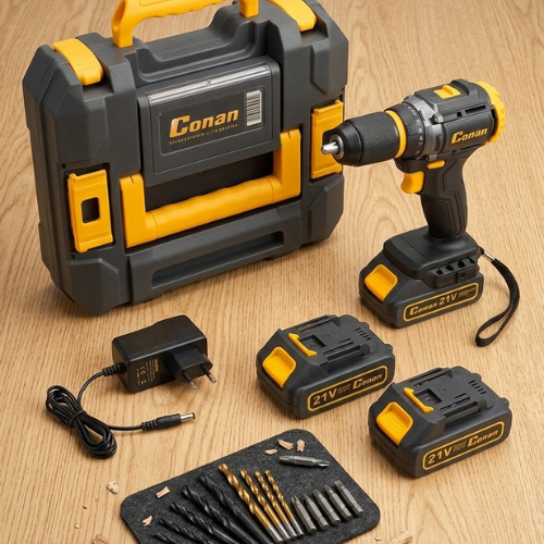 دريل كهربائي لاسلكي قوي ببطاريتين ليثيوم 21V، يعطيك حرية الخدمة بلا كابل وقوة كبيرة في الثقب وربط البراغي. مصمم باش يخدم في الخشب، الحديد، وتركيب الأثاث بكل راحة ودقة.