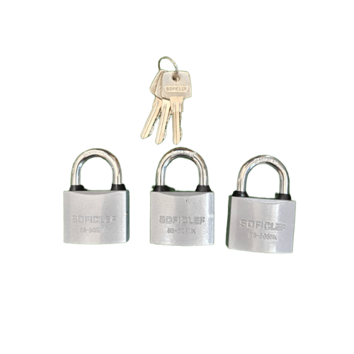 ها القفل مصنوع من فولاذ قوي، مقاوم للتآكل والصدأ، ويجيك بمقاس 50مم باش يعطيك حماية وأمان عالي.