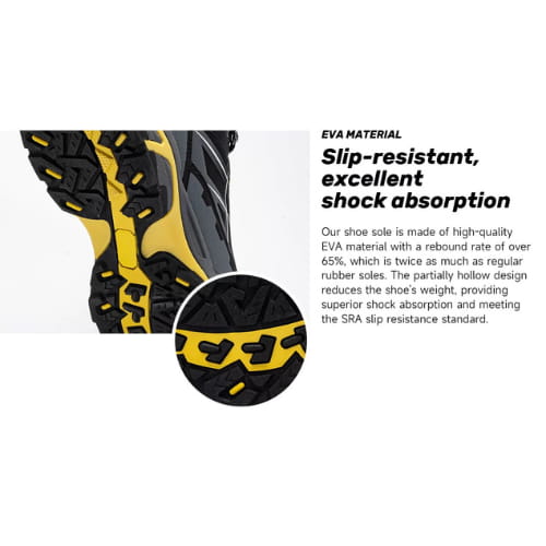 أحذية الأمان مجهزة بجزء علوي شبكي مسامي، مما يوفر تجربة تهوية فائقة للحفاظ على قدميك جافة وباردة طوال اليوم.