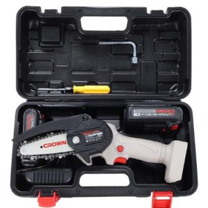 La mini scie à chaîne sans fil CROWNMini Scie À Chaîne SOLO S/FIL 20v 2,0Ah CROWN est un outil électrique compact et pratique conçu pour couper des branches, du bois de chauffage, du travail du bois et d’autres tâches manuelles.